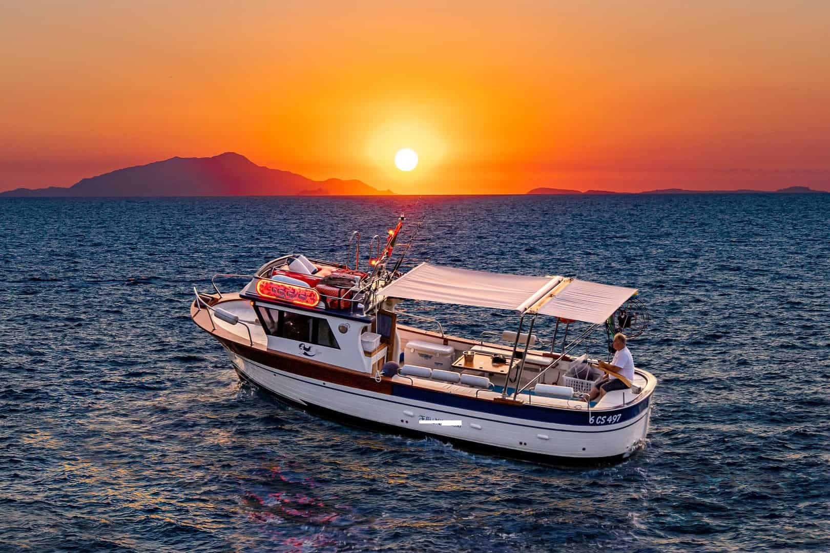 There is nothing quite like “Golden Hour” on the Mediterranean. As the sun dips toward the horizon, we’ll pause to take in the vibrant colors. It’s the perfect moment for a family photo or a quiet toast before the fishing action begins.